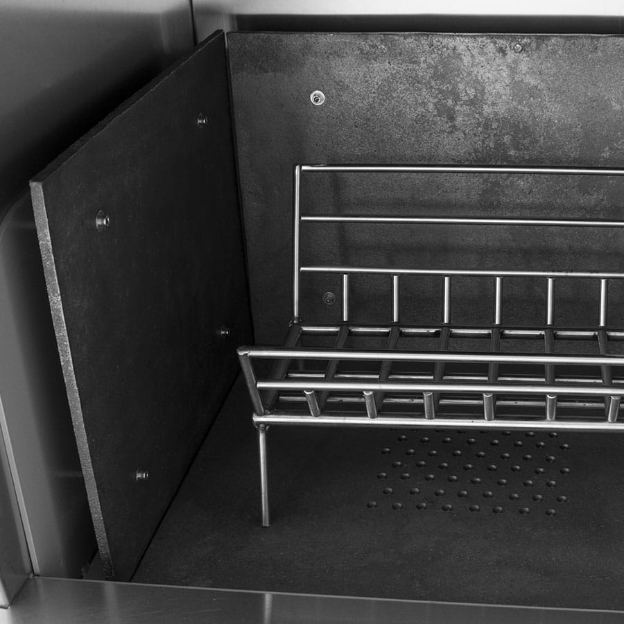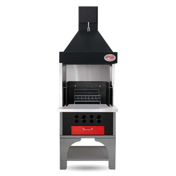 La vasca di raccolta per la brace, posizionata sotto il braciere, è in ghisa forata per assicurare la massima resistenza al calore. Può essere comodamente svuotata dalla brace accesa – da caricare nelle griglierie modulari – con l’utilizzo di una comune paletta. Il cassetto estraibile per il recupero della cenere, ne rende rapida la pulizia.
